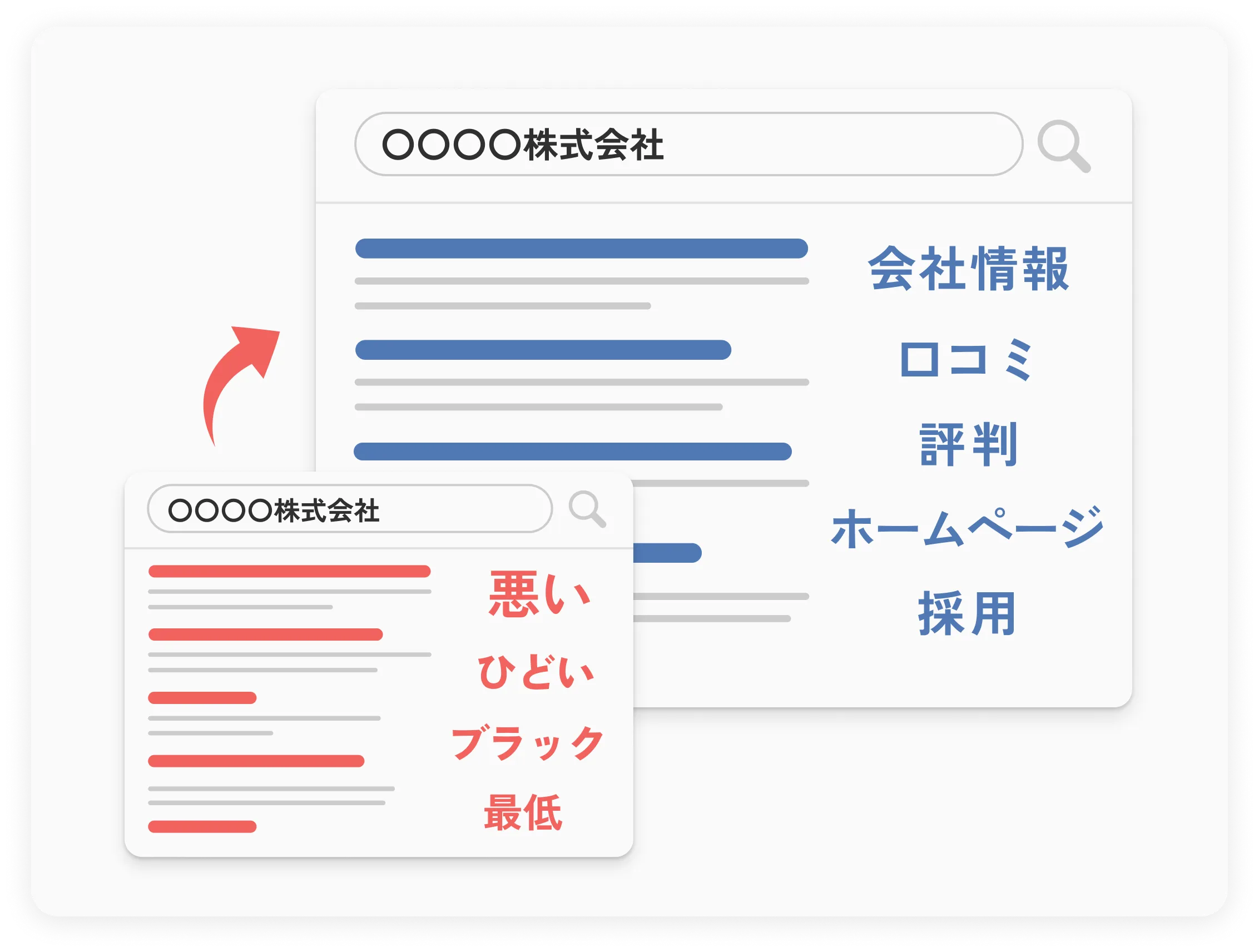 GoogleやYahoo!などの検索エンジンでキーワードを入力した際に表示されるネガティブな関連ワード(サジェスト)を最適化する対策です。