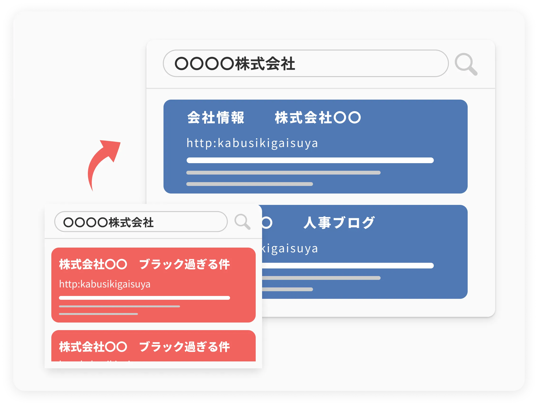 GoogleやYahoo!などの検索エンジンで検索を行った際、上位に表示されたネガティブなサイトの順位を下げる対策です。