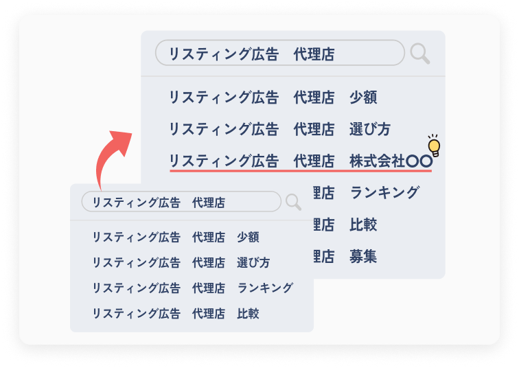 ポジティブなキーワードを検索した際に、検索サジェストに会社名やサービス名を併せて表示させることで指名検索へと誘導し、ネット上のブランド認知を確立させるサービスです。
