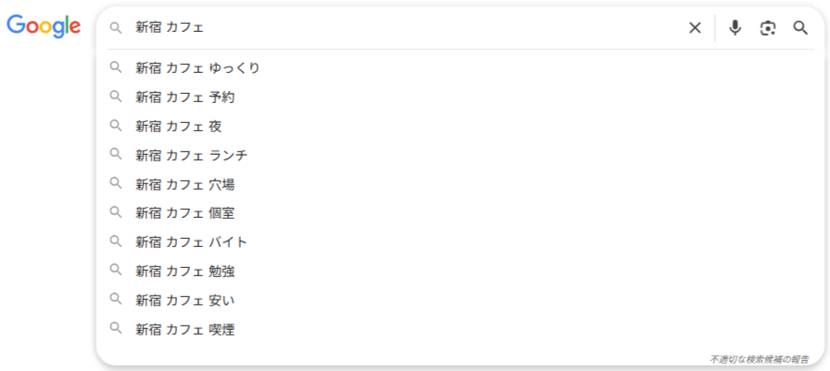 例えば、「新宿 カフェ」で検索すると検索候補として色々なキーワードが出てきます。